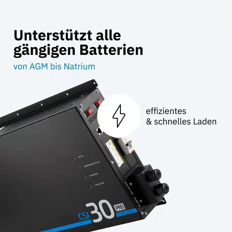 Der CSI PA PRO ist ein vollwertiges Energiezentrum, das Wechselrichter, Power-Assist, Ladegerät, Netztransfer und Kommunikationsschnittstellen in einem einzigen Gerät vereint. Die Landstrombegrenzung schützt die Absicherung auf dem Campingplatz, während Power-Assist automatisch Batteriestrom ergänzt – so kannst du selbst auf Stellplätzen in Italien dein Induktionskochfeld betreiben, ohne die Sicherung auszulösen. Das integrierte 150-A-Ladegerät lädt AGM-, Gel-, Nass-, oder Lithiumbatterien extrem schnell und effizient. In kurzen Intervallen prüft das Gerät den Batteriestatus und hält den Akku bei Landstrom automatisch voll – perfekt, um immer mit 100 % Kapazität zu starten.